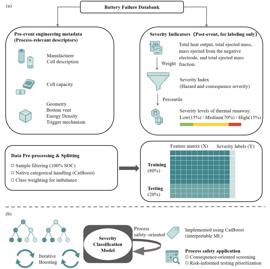 提出一种基于结构与工程元数据的锂离子电池热失控事前严重度预测框架,构建融合放热与喷射特征的危险导向严重度指数(Severity Index),并基于 CatBoost 实现多分类预测,整体准确率达 81%,对高危事件识别率 100%。通过 SHAP 可解释分析揭示关键安全影响因素,支持风险导向电池安全评估。